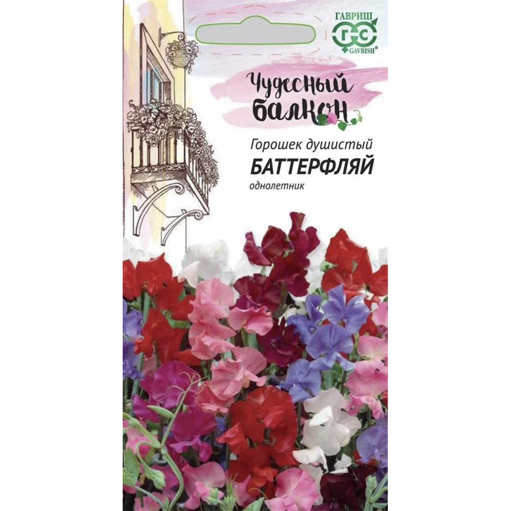 С горошком Баттерфляй любой балкон превратится в уютный благоухающий уголок. Сладкий и нежный аромат цветков «оживит атмосферу», поднимет настроение. С июня по сентябрь ваш балкон будет в веселом разноцветье. Горошек - растение лазящее, нуждается в опоре. Опорой может служить решетка либо сетка, натянутая вертикально вдоль стены. Развиваются растения быстро, легко «завоевывая» высоту в 1,5-2 м. Цветки крупные, до 3-4 см, собраны в изящные кисти по 5-6 цветков с длиной цветоносов 20-25 см. Горошек влаголюбив и холодостоек, предпочитает плодородные почвы. Выращивают семенами через рассаду (посев в марте-апреле) или прямым посевом в ящики в начале мая. Всходы появляются через 10-14 дней. Расстояние между растениями 15-20 см. Семена перед посевом желательно прорастить.