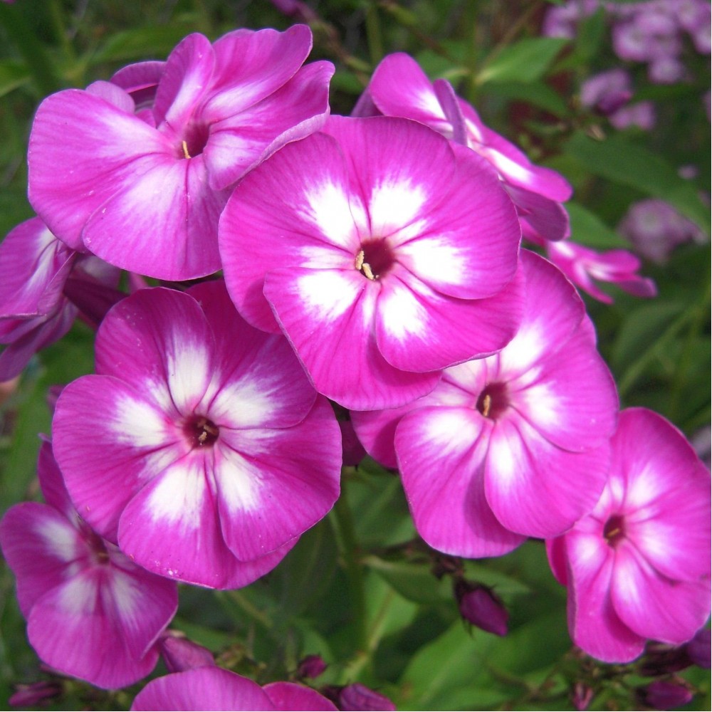 Флокс метельчатый Катенька-Катюша - нежно-розовые цветки с малиновым глазком в центре. Розовая штриховка по всему полю лепестков. Высота взрослого куста Флокса метельчатого Катенька-Катюша достигает 75 см, цветы диаметром 4,3 см