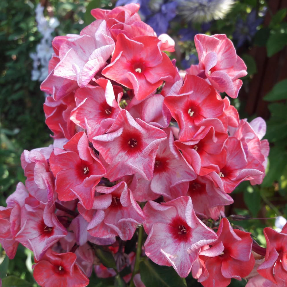 Флокс метельчатый Уральские Сказы (Phlox paniculata) будет интересен своим разносортным цветом и неординарным окрасом, который не боится воздействия солнечных лучей. Особенно эффектно выглядят сероватые прожилки по темно-розовому полю лепестка с насыщенным карминным оттенком семенной коробки в центре. Эти объемные цветы с изогнутыми лепестками собраны в большие плотные соцветия и в период их раскрытия одаривают своим душистым ароматом. Для интенсивного развития стебля, цельнокрайних листков и пышного бутона рекомендуется высадка Флокса метельчатого Уральские Сказы на прохладный, но солнечный участок с рыхлой почвой.