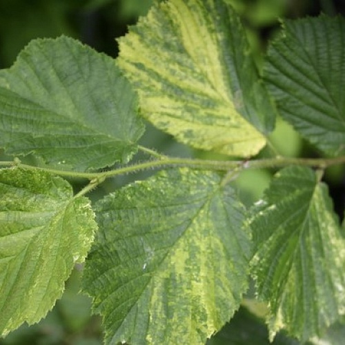 Листья 5-12 см длиной и шириной 9 см, округлые, заостренные на вершине и сердцевидные у основания, зубчатые. Молодые листья пурпурные, старые-зеленые с белыми или желтыми, окраской пятнами или полосами, некоторые полностью зеленые.