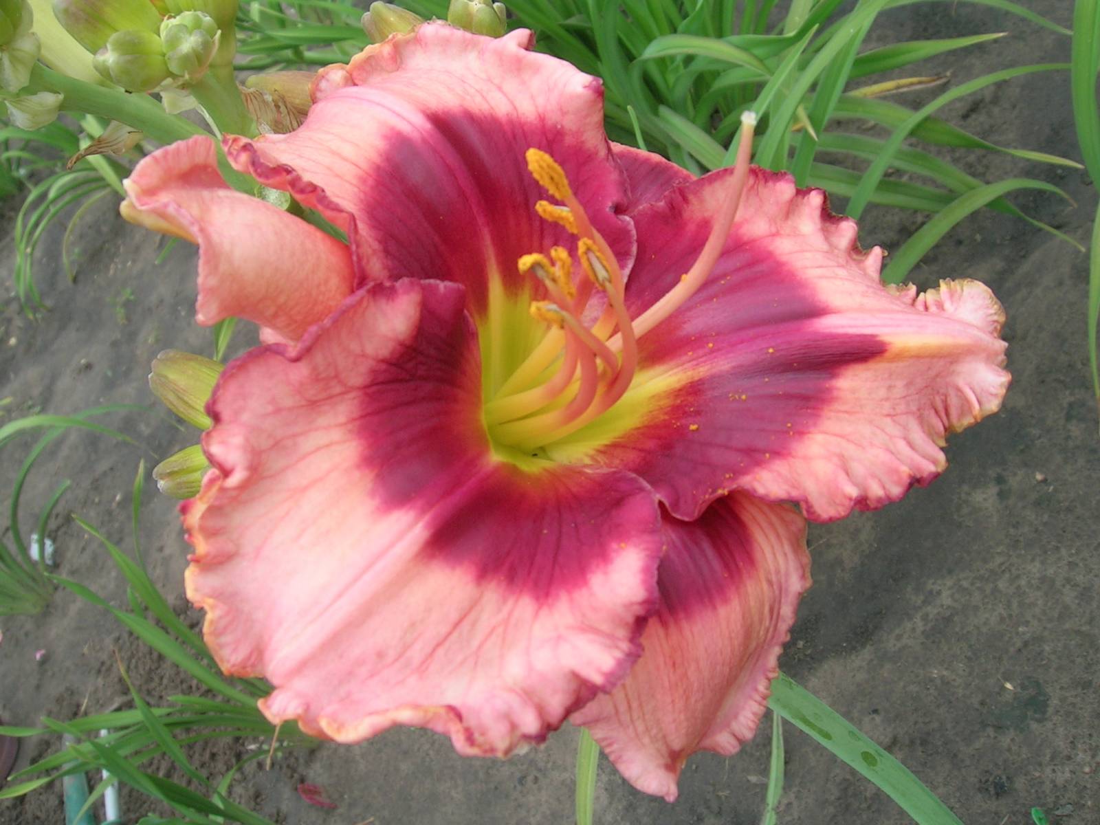 Лилейник гибридный Дан Махони (Hemerocallis) — один из наиболее подходящий сортов для ценителей спокойных оттенков. Он цветет с июля, и в течение нескольких недель на нем образуются крупные воздушные цветы до 12 см в диаметре. Их лепестки нежные, волнистые, гофрированные, светло-розовые с переходом в лососевый на кайме и около сердцевины. Центр выделяется — он желтый, здесь также находятся золотистые тычинки.