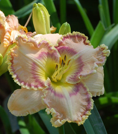 Саженцы лилейника Sink Into Your Eyes — великолепный сорт с розово-кремовыми цветками, с золотистым центром и темно-фиолетовой каймой. Сорт отличается интенсивностью цвета и возможностью повторного цветения. Используется для украшения клумб, рабаток, в одиночных и групповых посадках. Крупномер Sink Into Your Eyes в диаметре достигает 14 см, зацветает в конце июля и в августе. Высота растения — 70 см. Повторноцветущий тетраплоид. Окраска цветка — розово-кремовая, с темно-фиолетовой яркой каймой и золотистой сердцевиной.Требование к освещенности — любит солнце, но переносит и полутень. Требование к почве — любые, особых требований к почве не предъявляет. Требования к поливу — не любит частых поливов.