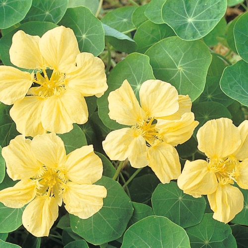 Настурция Крем Карамель - эта настурция будет высоко оценена теми, кто хочет насладиться спокойными пастельными тонами в яркой садовой цветовой гамме жаркого лета, или просто желает вырастить что-нибудь необычное. Данный сорт имеет наиболее близкие по цвету к белой окраске цветки, имеющие деликатную окраску слоновой кости. Растение высотой до 2 м, свето- и теплолюбиво. Цветки крупные. Может использоваться как почвопокровное растение, а в случае обеспечения опоры растение будет карабкаться по ней вверх.