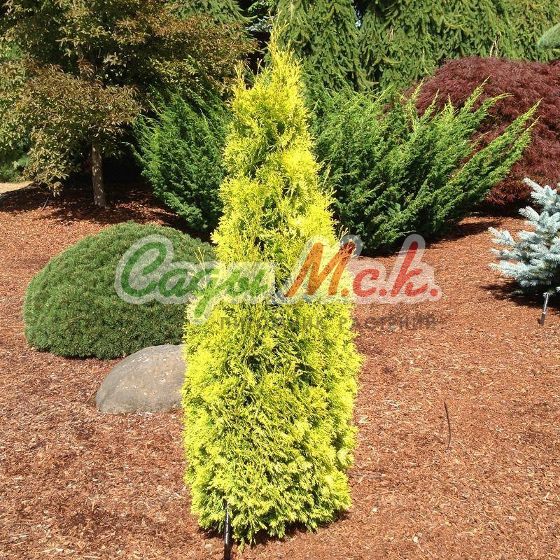 Узкая острая желто-хвойная туя высотой до 10 м. и диаметром кроны до 1,8 м. Дерево растет довольно быстро, ежегодно прибавляя до 30 см высоты. Имеет прямой, ровный и стройный ствол, к которому плотно прижимаются скелетные ветви, образуя красивую устремленную вверх общую форму дерева.Скелетные ветки короткие и мощные, тесно прижимаются друг к другу, а на концах начинают сильно ветвиться. За счет такого строение крона выглядит очень густой и плотной, формируется симметрично. Хвоя густая, яркая, золотисто-жёлтая, не подгорает на солнце, зимой приобретает бронзовый оттенок. Хорошо себя чувствует как на солнце, так и в полутени. На солнце не горит.<br>